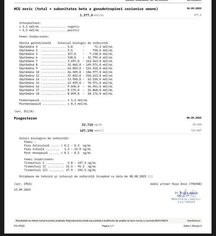 Criss4 wrote:Fetelor a sosit rezultatul! Se pare ca Dumnezeu ne iubește și pe noi! ❤️❤️ Beta 1.377 Progesteronul are ok oare? Medicul încă nu a răspuns. 🤔 https://i.postimg.cc/1XJBkBQL/IMG-9963.jpgEdit: între timp am reușit să vorbesc cu medicul ginecolog, analiza e foarte bine, mi-a dat tratament de susținere a sarcinii până merg la el, m-am programat pt joi la medic. Voi avea 5 sapt și 1 zii. Medicul a zis ca la aceasta valoare sigur săptămâna următoare ecografic se vede sacul gestațional. 🥺🥺